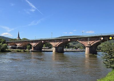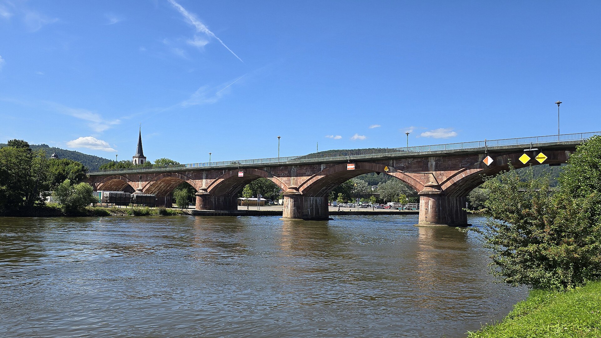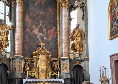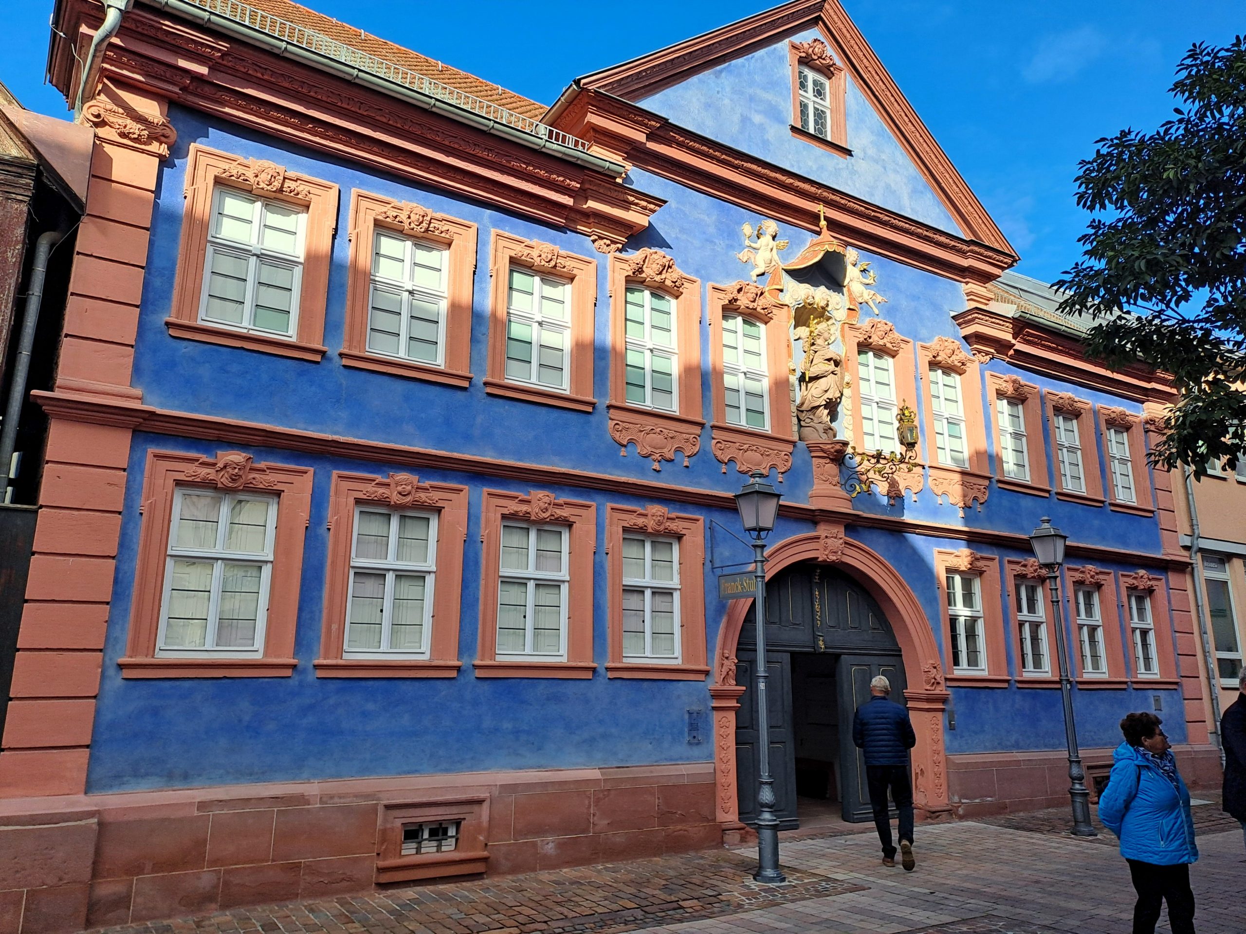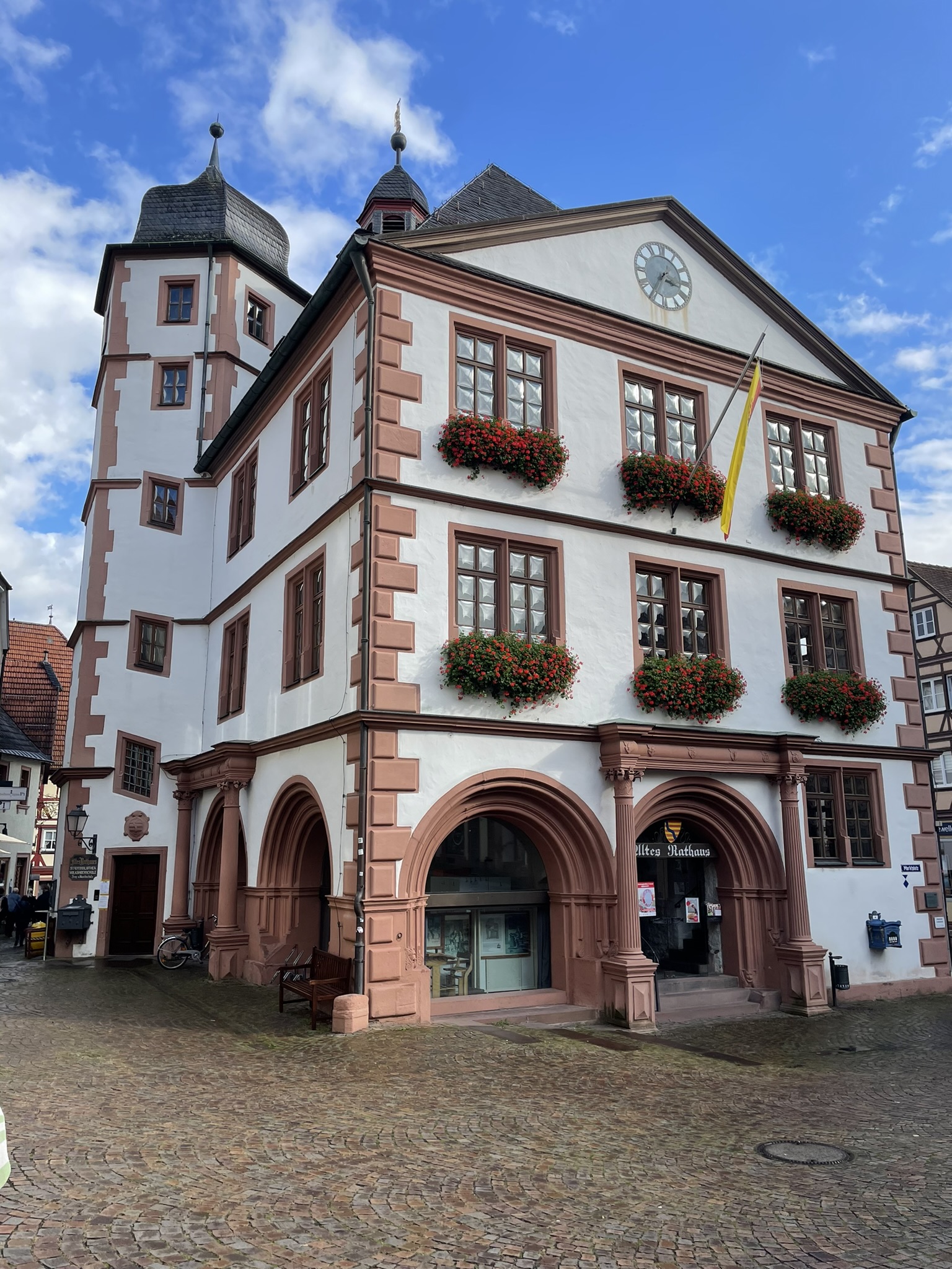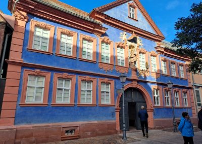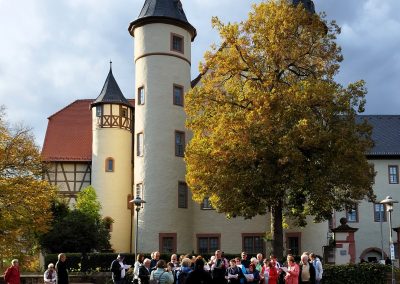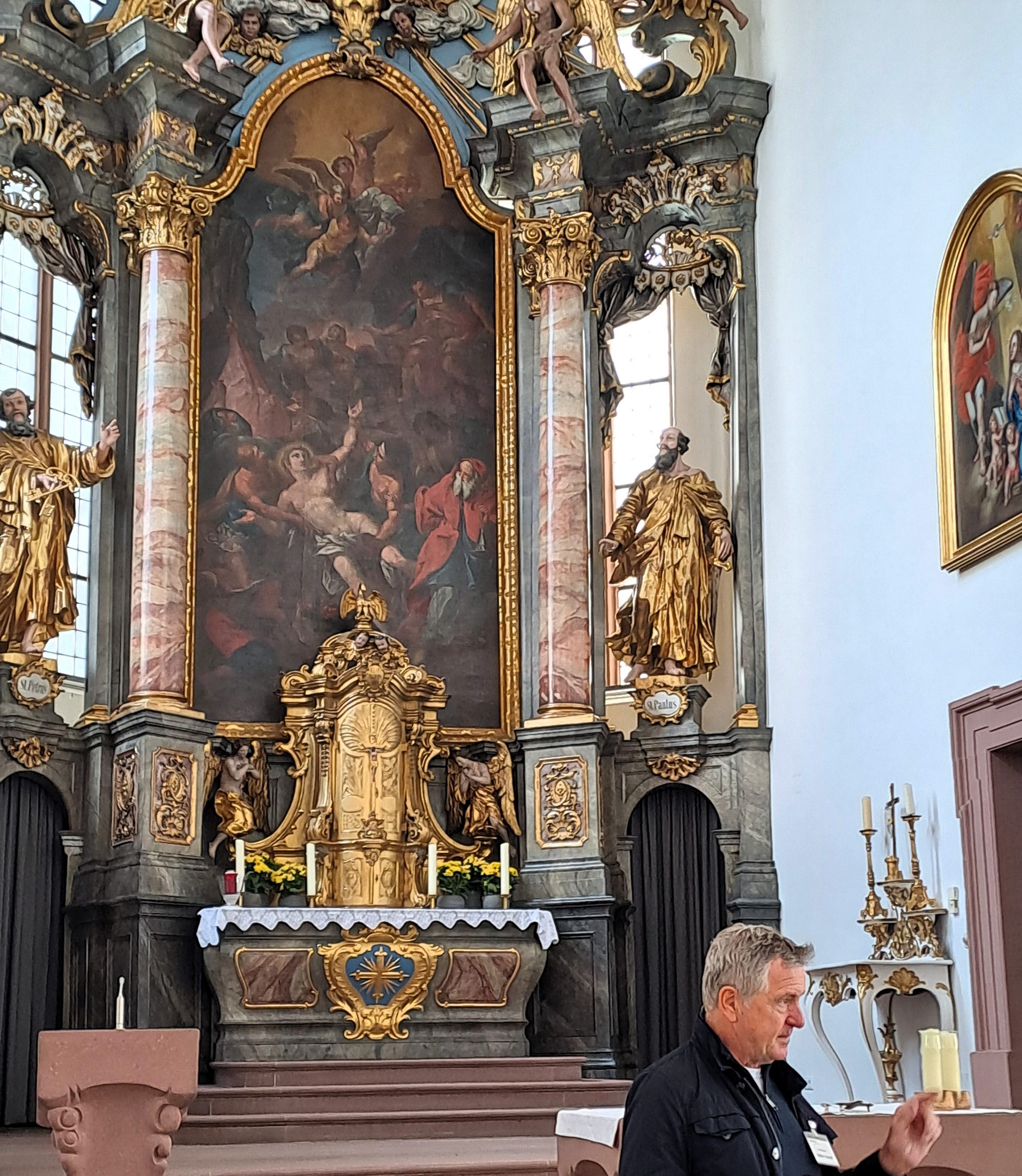 Der geführte Rundgang durch Marktheidenfeld begann mit Blick auf die imposante Mainbrücke, der ersten steinernen Mainbrücke zwischen Würzburg und Aschaffenburg. Beeindruckend der Spaziergang entlang der Mainpromenade des Ortes mit alten restaurierten Fischerhäusern und den davorstehenden Walnussbäumen, zumal der Blick auf den Main nicht durch eine Eisenbahnlinie oder eine vielbefahrene Straße wie anderorts gestört wird. Ein Highlight des Stadtrundgangs war das Franck-Haus mit seiner blauen Prunkfassade, in dem der Überlieferung nach die Sektherstellung in Deutschland erfunden wurde. Der Festsaal im Obergeschoss bot mit gemalten Wandbespannungen einen prächtigen Anblick, der u.a. für Trauungen genutzt wird. Von den ausführlichen Erklärungen des Stadtführers leicht ermattet, setzten sich dann auch gleich welche von der Reisegruppe in die Prachtstühle der Brautleute vor dem Tisch des Bürgermeisters, um sich auszuruhen? – Nein, sicherlich nutzen sie die Gelegenheit nur, um sich an den erhebenden Moment der eigenen Hochzeit noch einmal zu erinnern.