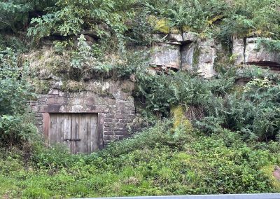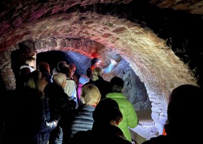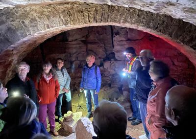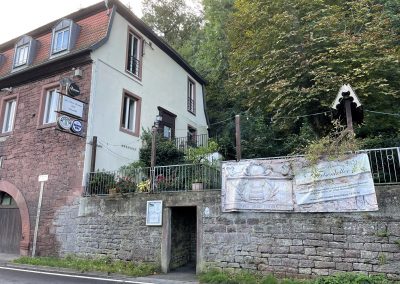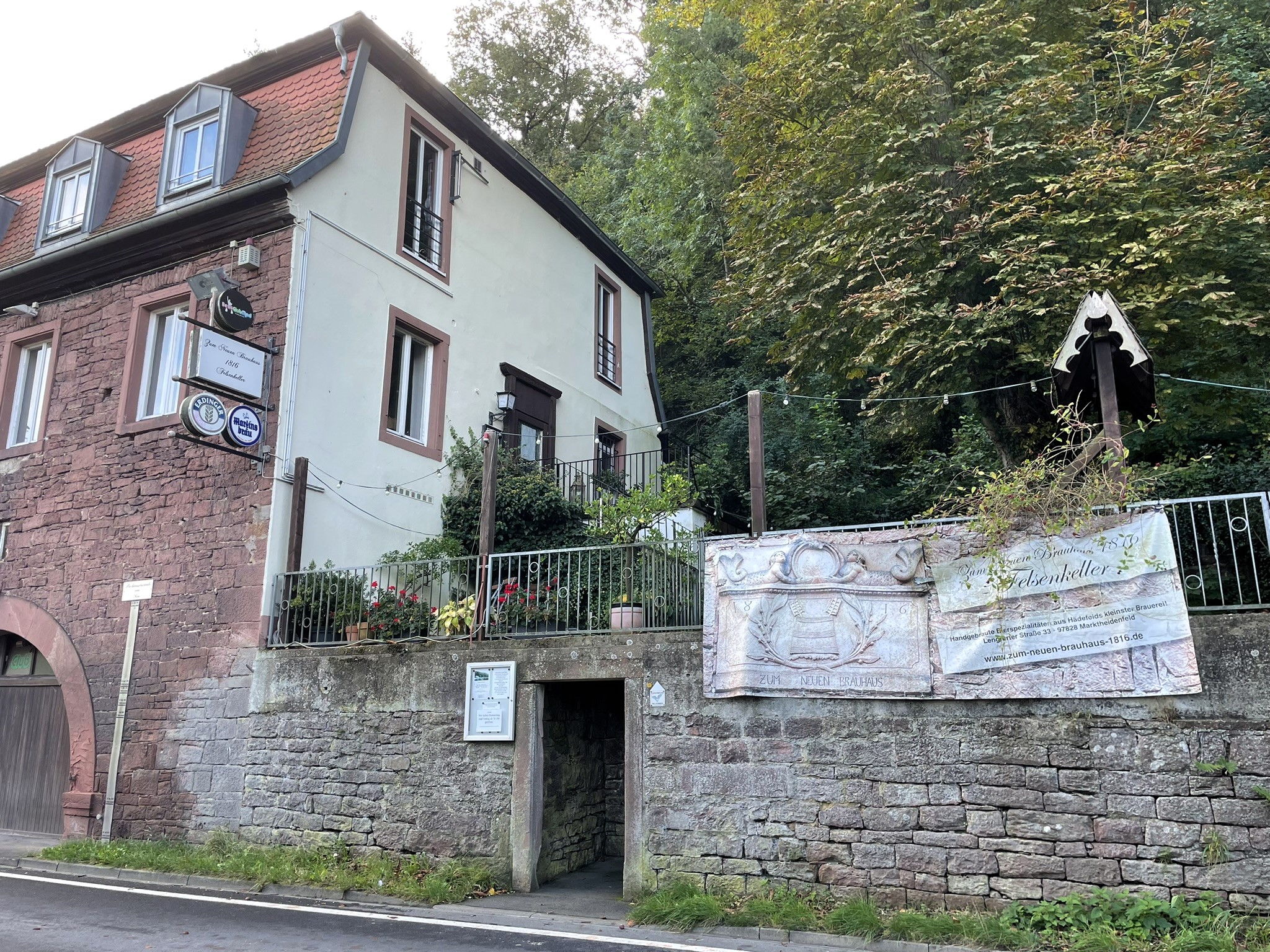 Es war schon eine harte Arbeit einen Keller in den roten Sandstein zu hauen, ganze 2 Jahre dauerte es bis ein 40-50 Meter langer Keller mit ca. 5 Meter Breite fertig war. Da der Sandstein nicht so stabil ist, wurde immer 2 Meter tief gehauen, dann ein Gewölbe Gerüst aus Holz drunter gezimmert und schließlich mit dem ausgeschlagenen Sandstein ein Gewölbe drüber gemauert. Das Holzgerüst wurde wieder abgebaut und wieder 2 Meter weitergehauen, bis man die gewünscht Kellertiefe erreicht hatte. Die ganze Mühe wurde investiert, um das gebraute Bier möglichst kühl zu lagern. Später errichtete man davor Schankhallen, um das Bier direkt vor dem Keller auszuschenken zu können. Als dann vor ca. 100 Jahren die elektrisch betriebenen Kühlschränke auf den Markt kamen, wurden die Keller nicht mehr zur Bierkühlung benötigt. Die Keller wurden dann von ihren Besitzern noch zur Lagerung von Lebensmittel genutzt und die Schankhallen mussten in den 30ziger Jahren der Hauptstraße weichen. Heute ist nur noch der älteste der ehemals sieben Felsenkeller frei zugänglich und der Hausherr Mäx machte mit uns eine Begehung, nachdem er uns Geschichten über das Leben am Main, die Wasserversorgung und die Biertradition rund um Marktheidenfeld und die Keller erzählt hat.