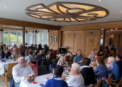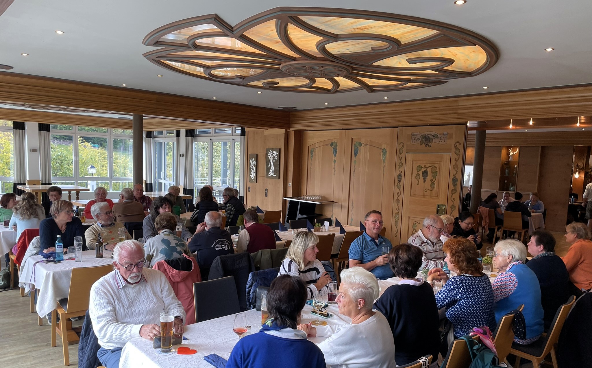 Durch die thüringische Landschaft fuhr der Bus dann weiter nach Saalburg am Bleilochstausee, einem der beiden größten Stauseen Deutschlands, die auch als das thüringische Meer bekannt sind. Beim Mittagessen im Restaurant Kranich konnten thüringische Bratwürste und sonstige Spezialitäten verspeist werden. Direkt unter dem Hotel stach danach das Motorschiff in See, das eine Stunde lang über den 28 Kilometer langen See tuckerte. Imposant war vor allem der Anblick der Bleilochtalsperre, mit ihrer 65 Meter hohen und 205 Meter langen Staumauer, die größte Talsperre Deutschlands. Während der Seefahrt spielte Vereinsvorsitzender Gerhard Egloffstein mit seinem Akkordeon zu Seemannsliedern auf. Vor allem bei „Wir lagen vor Madagaskar“ sangen alle kräftig mit. Sangestrunken setzten das danach noch viele in einer Bootsverleihkantine mit einem Heringsimbiss fort, bevor es wieder nach Hause ging und im Bus zuletzt „Kein schöner Land“ erschallte.